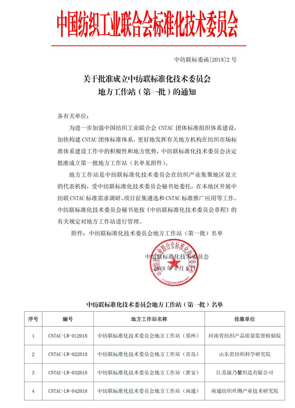 2018年4月8日,中纺联标准化技术委员会公布了首批地方工作站名单,米兰app官方官网等四家单位成功获批。